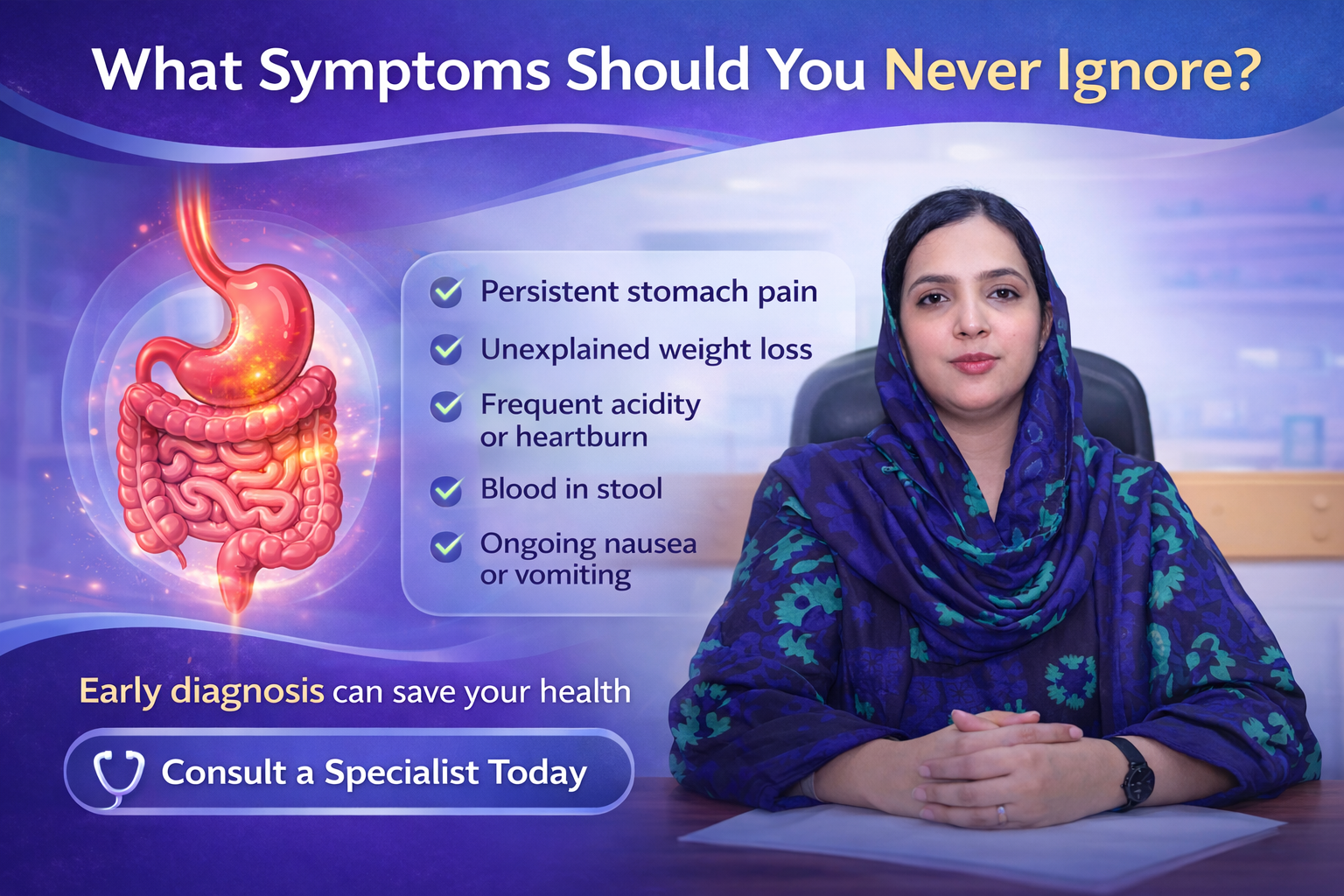 Delaying care can worsen the condition and make recovery difficult.A female gastroenterologist in Karachi ensures timely diagnosis and proper care.